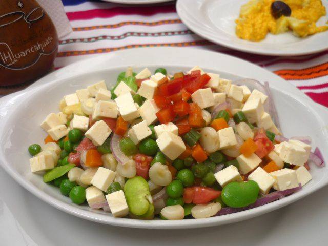 Le Soltero de queso est une salade typique d’Arequipa qui combine du fromage frais coupé en dés avec du maïs, des fèves, de la tomate, de l’oignon, des olives et des poivrons rocoto, le tout assaisonné d’huile d’olive et de vinaigre. C’est un plat léger, coloré et rafraîchissant, idéal pour les journées chaudes.